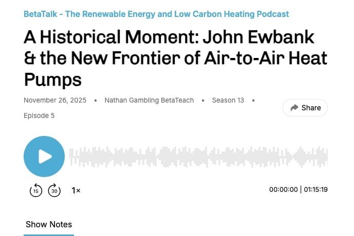 In this landmark episode of BetaTalk, the host sits down with John Ewbank to discuss his pioneering and invaluable research into the domestic application of Air-to-Air Heat Pumps (A2A HPs).